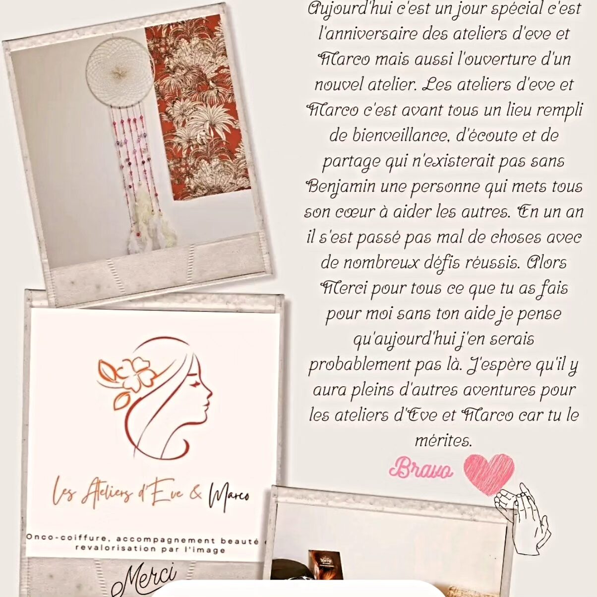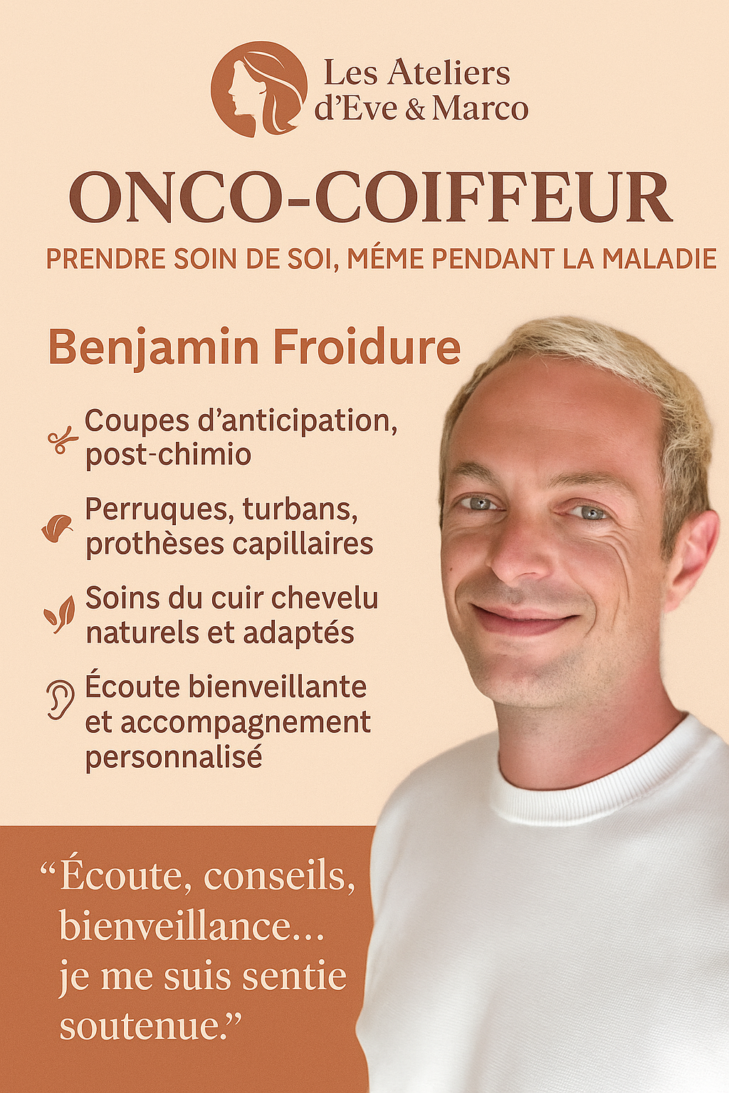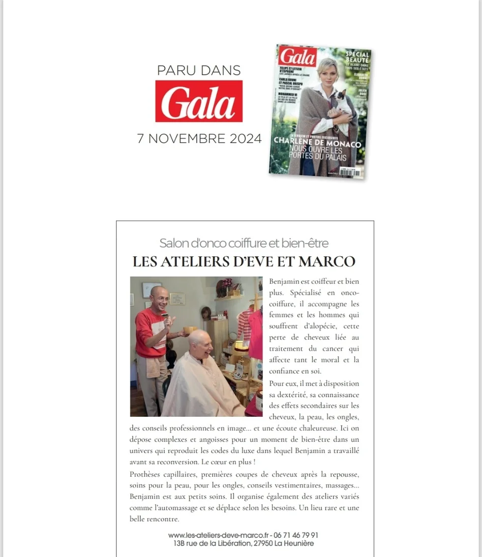Aujourd’hui, Benjamin est fier de développer l’accompagnement capillaire et psychologique dans les hôpitaux, résidences autonomies et soins palliatifs (avec la participation et l’écoute scientifique de Rémi GUYOMARCH), tout en formant d’autres professionnels de santé. Le nom Eve & Marco est devenu synonyme de bienveillance et d’espoir, un héritage qu’il porte avec fierté.